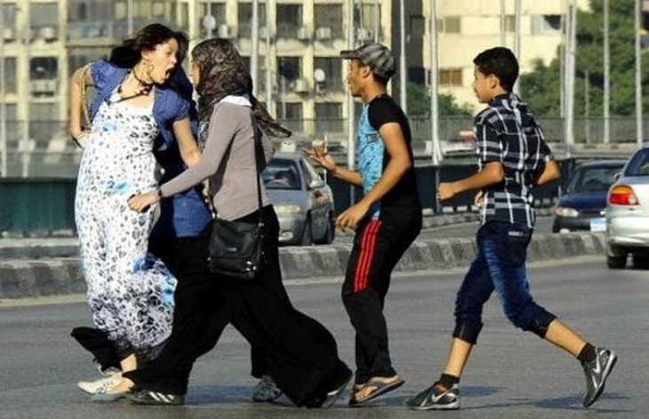 Below is a scene from Cairo, Egypt. Three boys chase down a woman and one of the boys touches her private parts. When she recoils in shock, the boys are nonchalant. Why? Since she isn't wearing the hijab, she must be a loose woman who deserves to be molested.